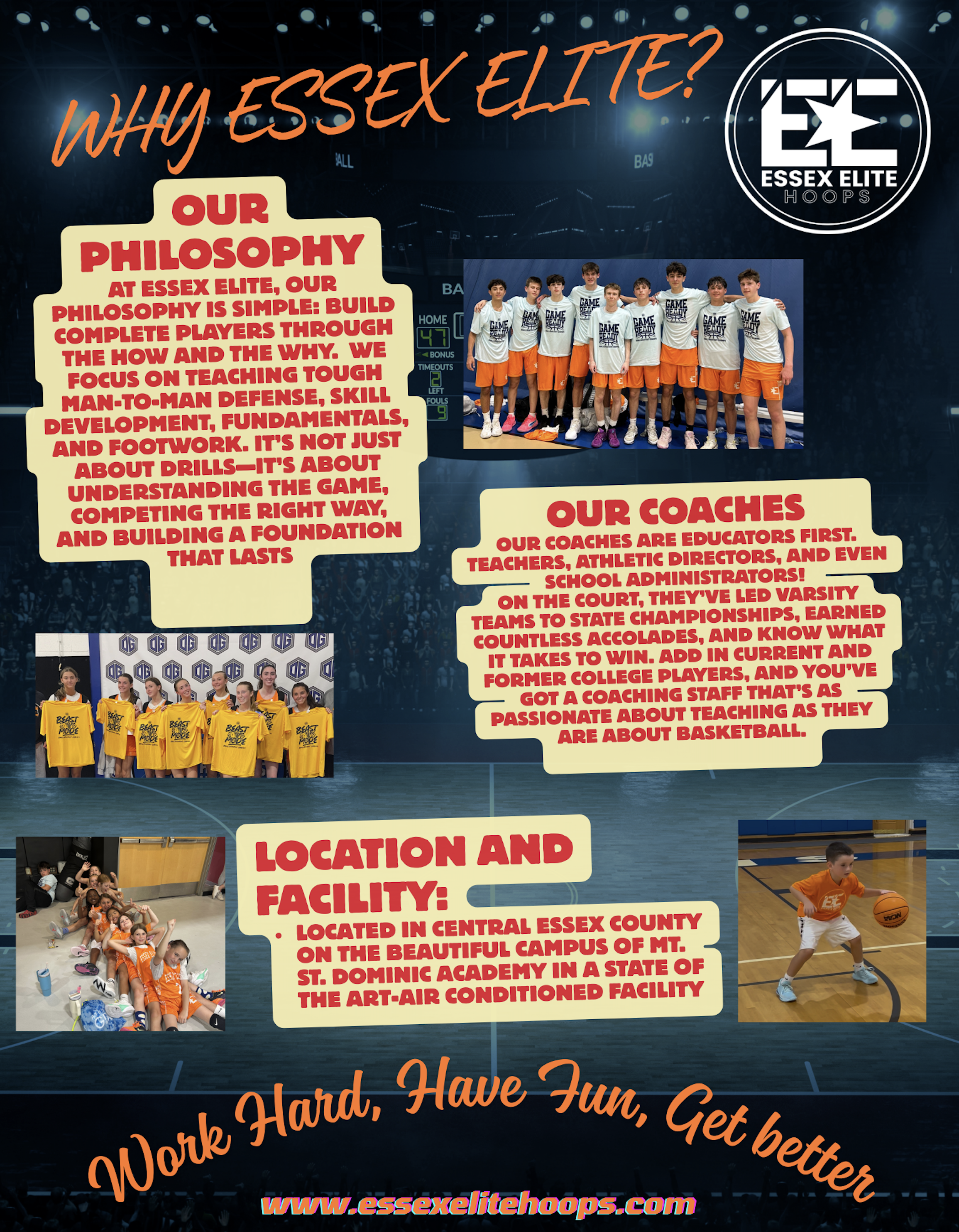 At Essex Elite Hoops, our extensive coaching experience has demonstrated the importance of dedication and skill development. We take great pride in helping student-athletes excel through our rigorous methodology. Every practice focuses on intense skill and drill sessions, complemented by game experiences designed to enhance player development. We believe this approach is the optimal way to foster improvement and success in our athletes. We love to work hard, have fun, and get better.